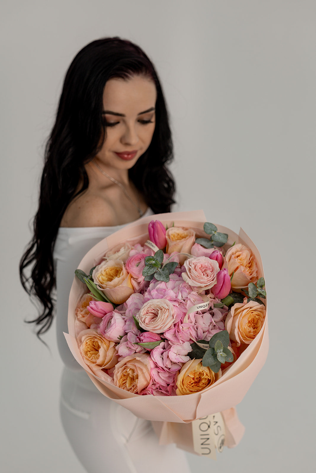 Celebrate elegance with our Pink Mixed Bouquet, a stunning arrangement featuring premium hydrangeas, garden roses, tulips, and ranunculus accented with lush eucalyptus. This carefully curated blend combines every girl's favorite flowers in soft, romantic pink tones that bring warmth and sophistication to any space. Perfect for expressing love, gratitude, or simply brightening someone's day, this delicate mix delivers garden-fresh beauty that lasts. Each stem is hand-selected to ensure maximum freshness and visual impact, making it an unforgettable gift that speaks volumes.