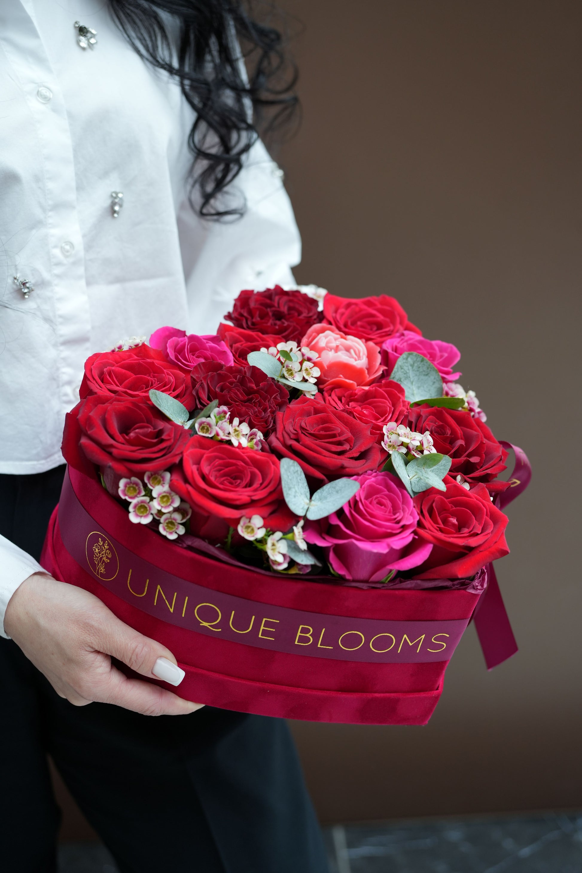 Indulge your loved one with the luxurious Rose Heart. This velvet heart box is filled with a mix of premium roses, making it a truly unique and special gift for Valentine’s Day.