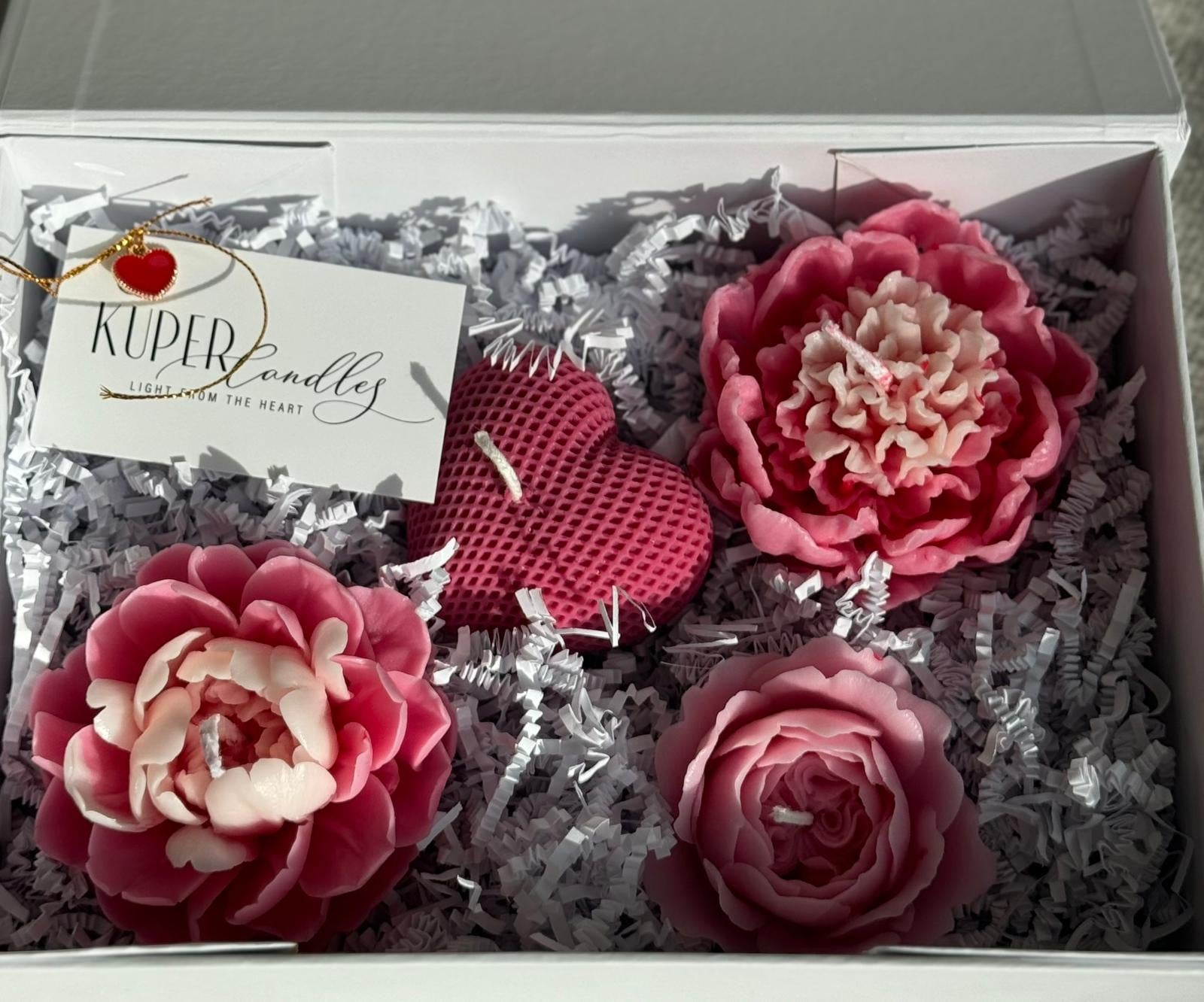 Illuminate your space with a set of four beautifully handcrafted scented peony candles by Kuper Candles. The perfect way to celebrate your love, adding a touch of romance and sophistication to your special day. A must-have for any Valentine's Day celebration.